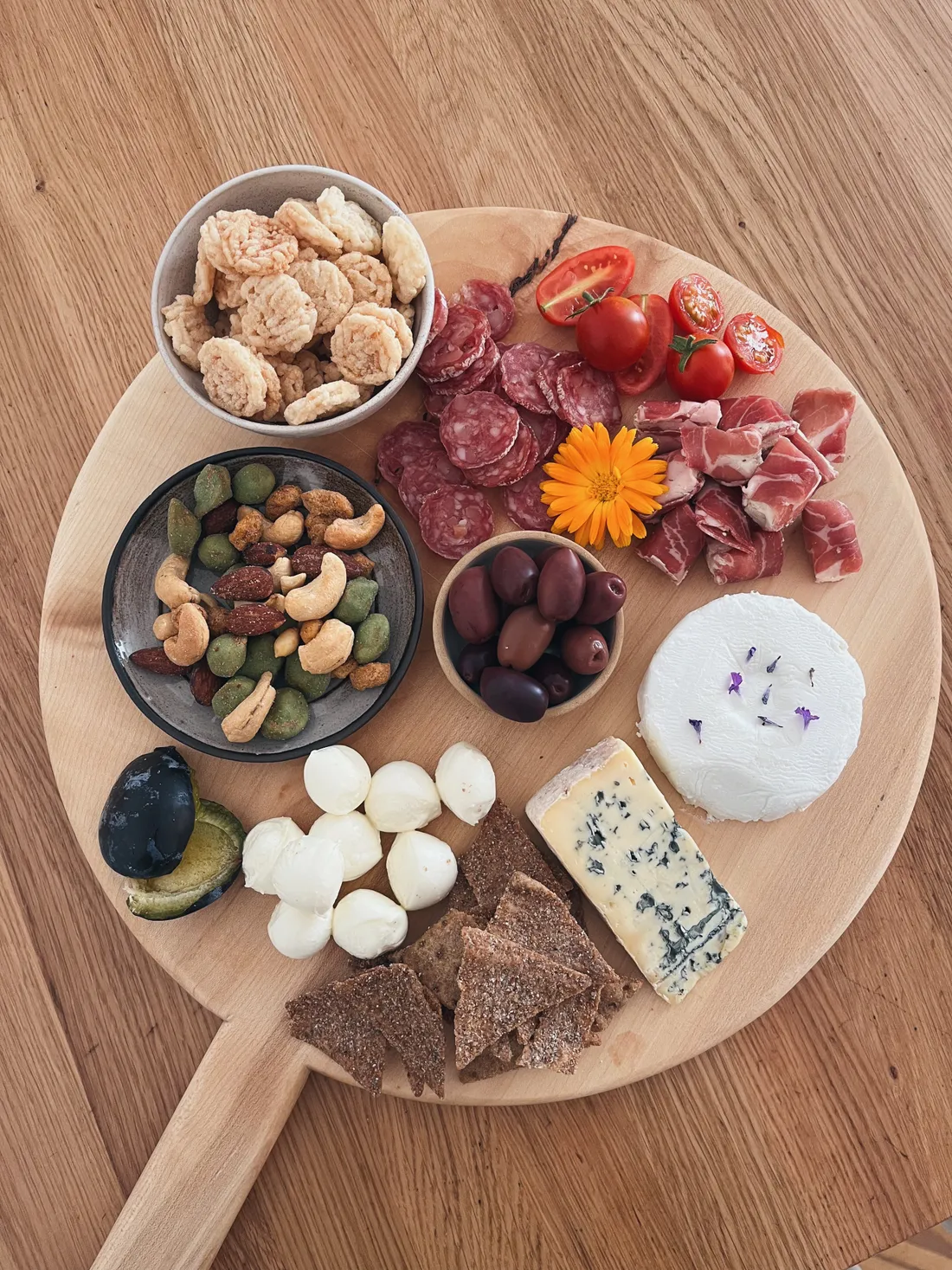 Oblíbená letní večeře - prkénko plné samých dobrých věcí. Šunky, sýry, olivy, wasabi oříšky (mňam!) a stranou bageta. Prkénko jsem si vyrobila na kurzu Hoblhome.