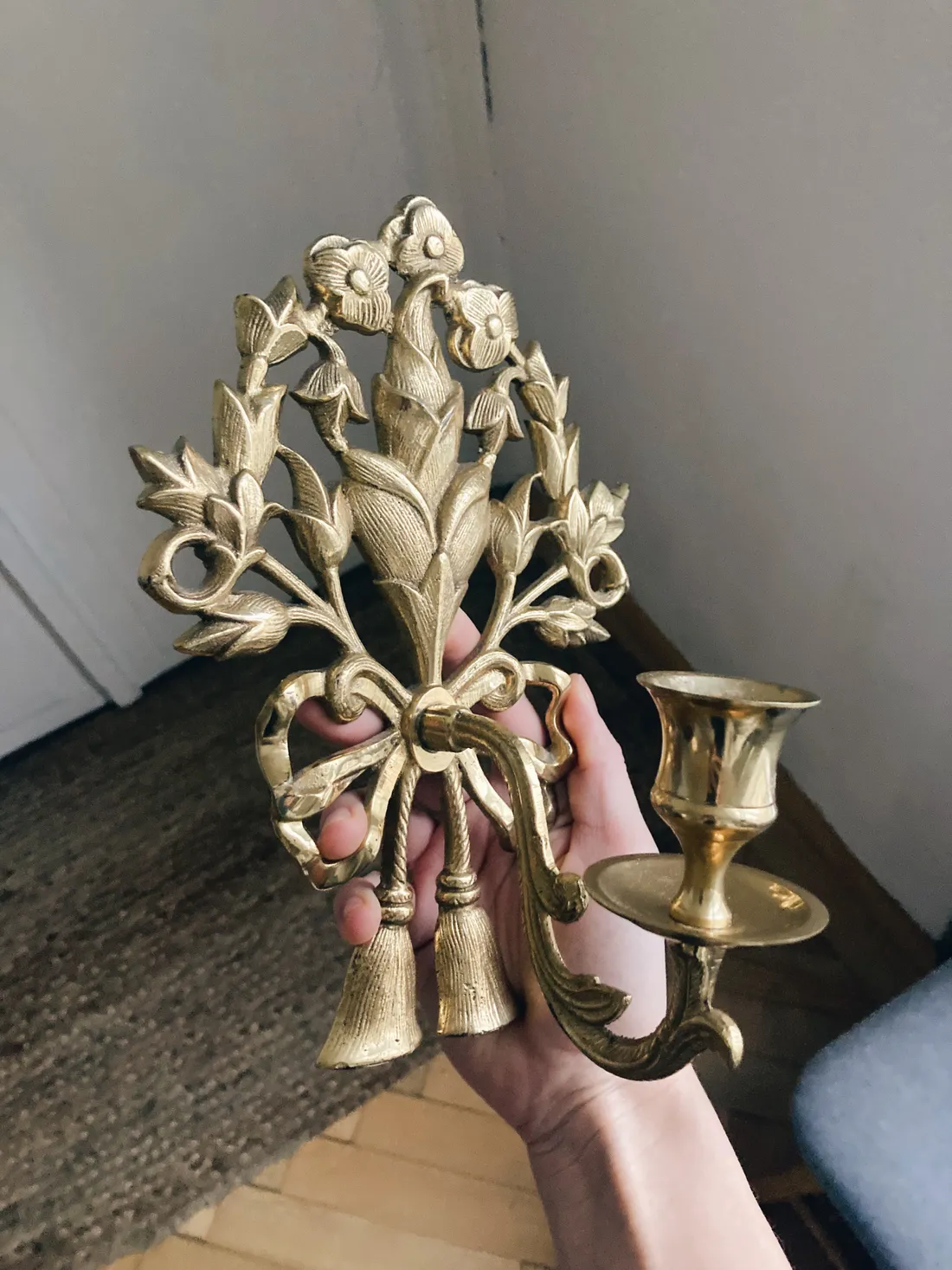 Z Vinted mi přišel mosazný svícen na stěnu, takový až zámecký kousek a možná trochu výstřední s kýčový, ale jsem z něho nadšená! Manžel o něco míň, protože musel navrtat hmoždinku.