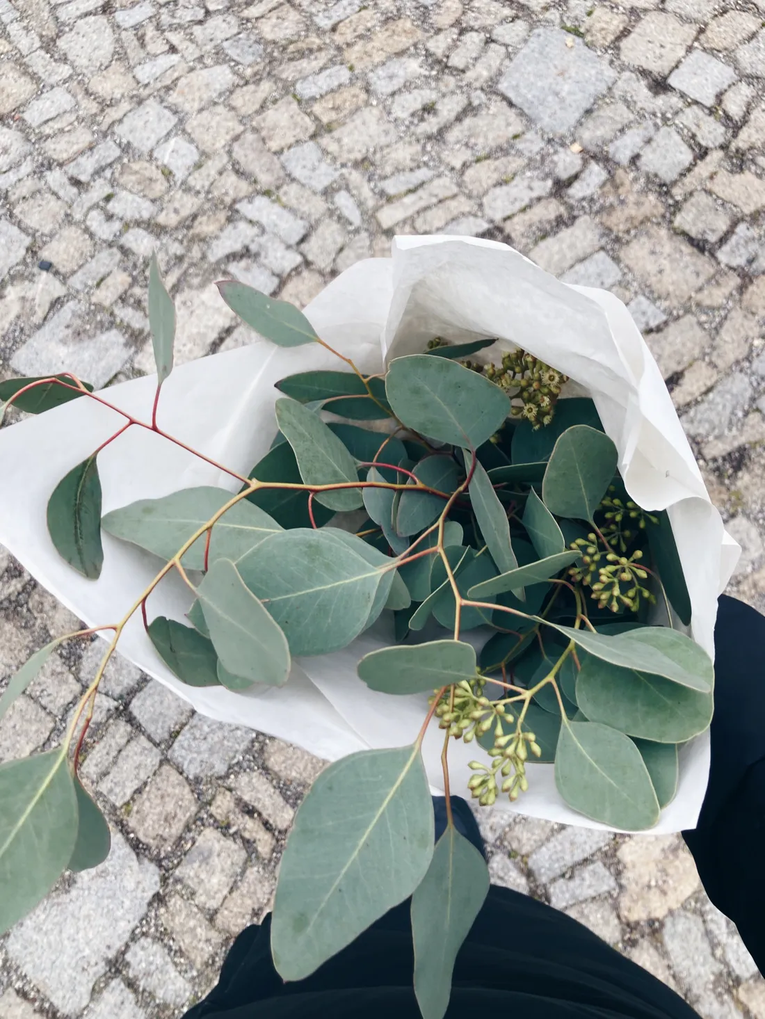 V pátek ráno jsem zavezla děti do školky, poslala kopec kuchařek a koupila jsem svazek eukalyptu do vázy. Tady ten druh je můj oblíbený.