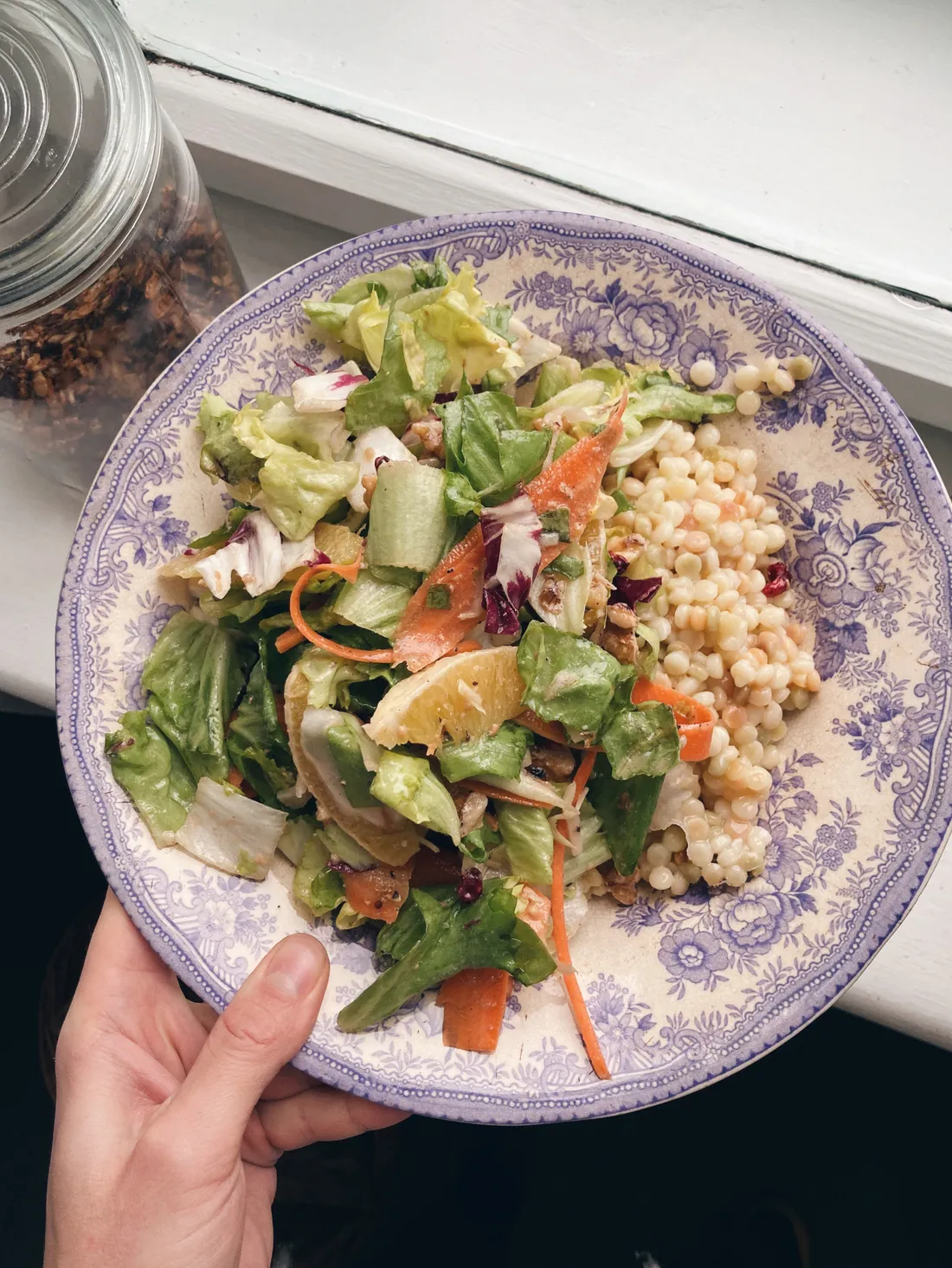 O obědu byl zimní salát s pomerančem, sušenými brusinkami, vlašáky a pomerančovou zálivkou. K němu perlový kuskus. Inspiraci jsem čerpala v newsletteru Mama eats plants.