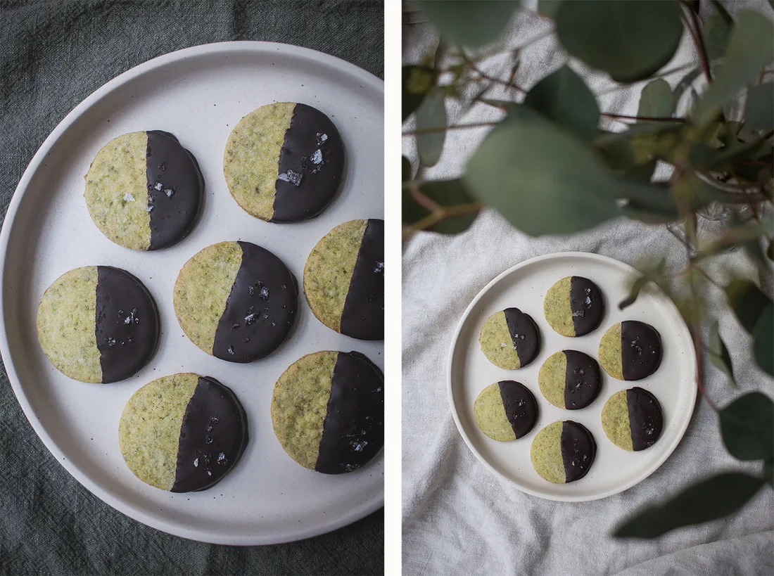 Jedno z nejrychlejších cukroví, které si ještě můžete upéct, budou moje sušenky z pistáciového marcipánu namáčené v čokoládě a posypané vločkami soli.