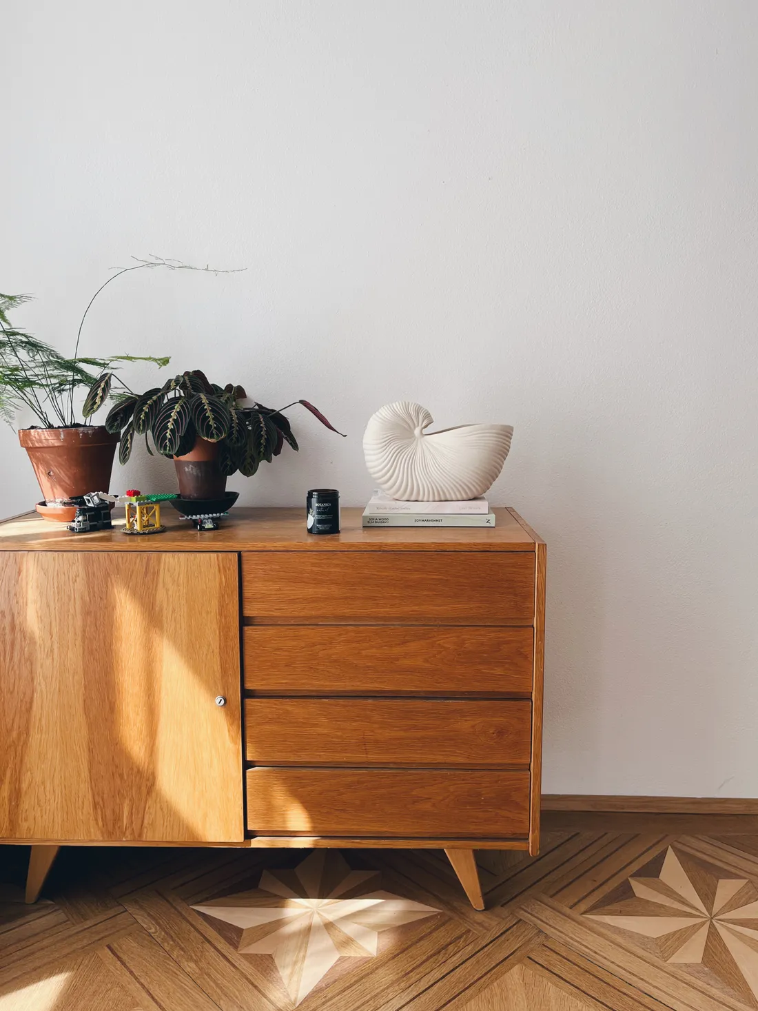 Poličku jsem ozdobila mušlí/vázou/květináčem od Ferm Living.