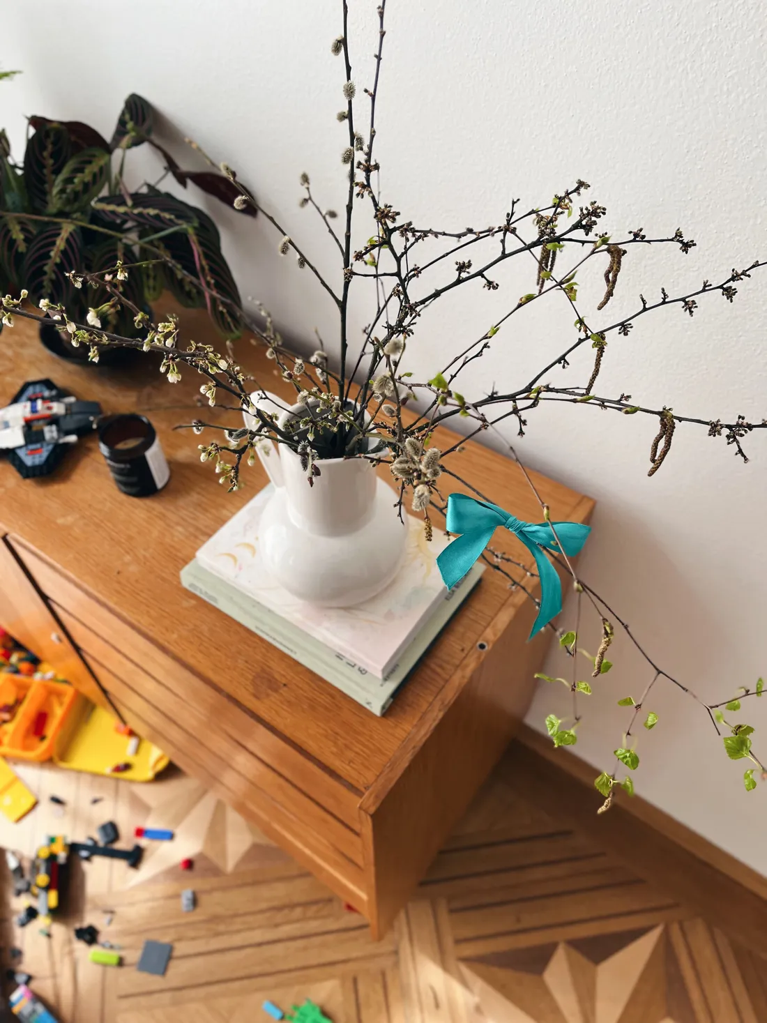 Ve váze vykvétají větvičky a od syna jsem dostala mašličku. Všude po bytě jsou kostičky lega, děti z něj v jednom kuse staví.