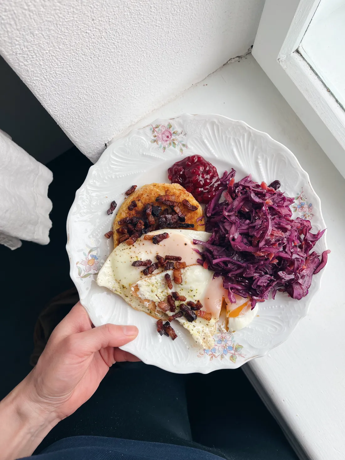 Další den jsem znova obědvala bramborové placky, tentokrát s volskými oky, slaninou a zelným salátem.