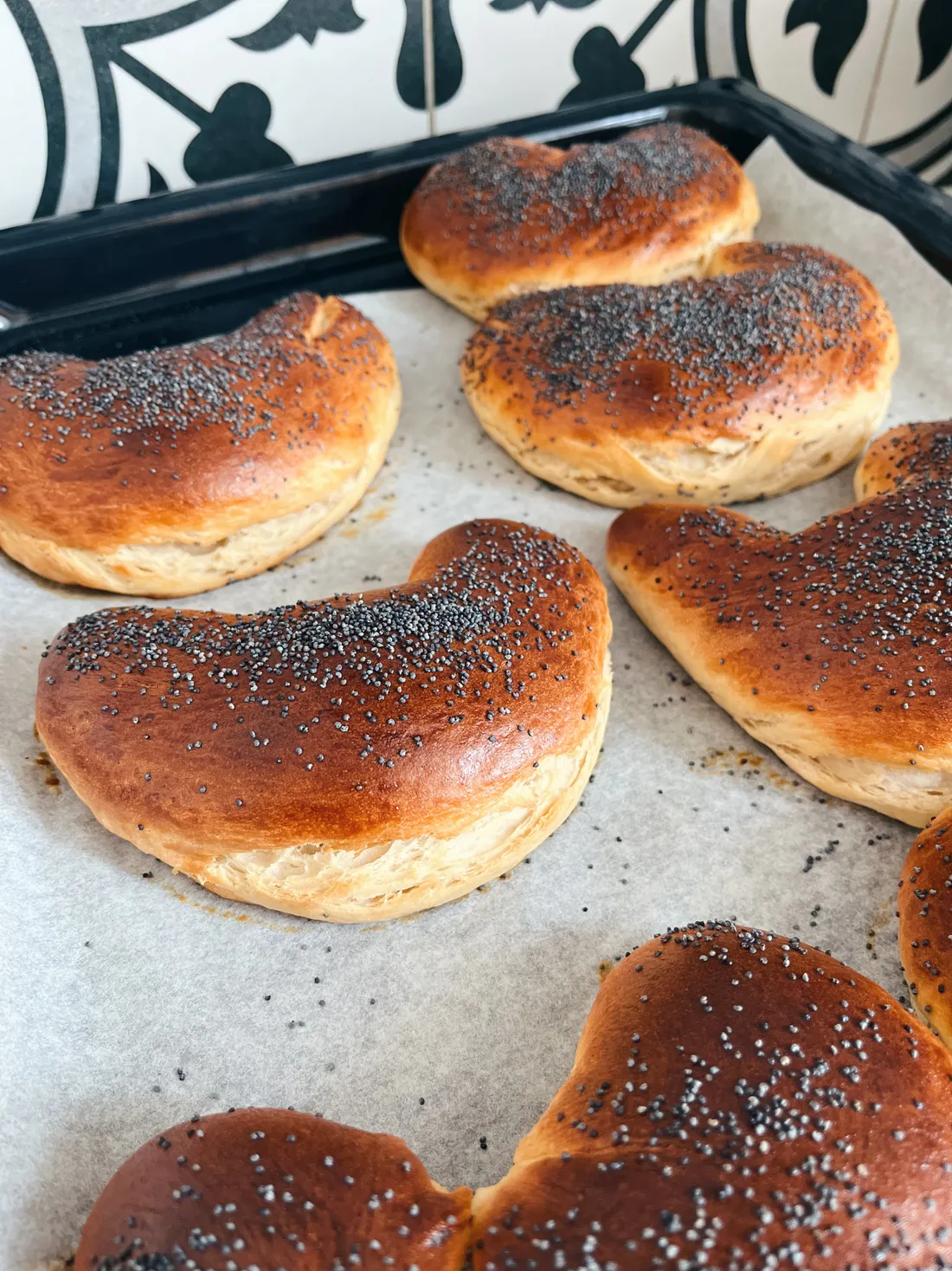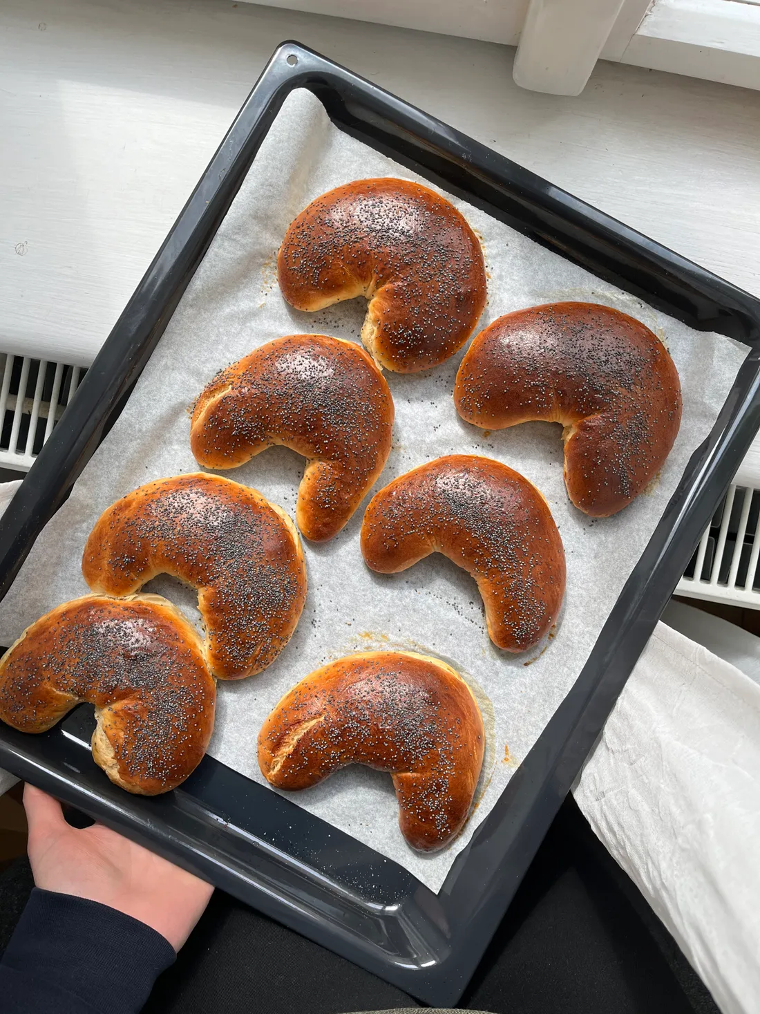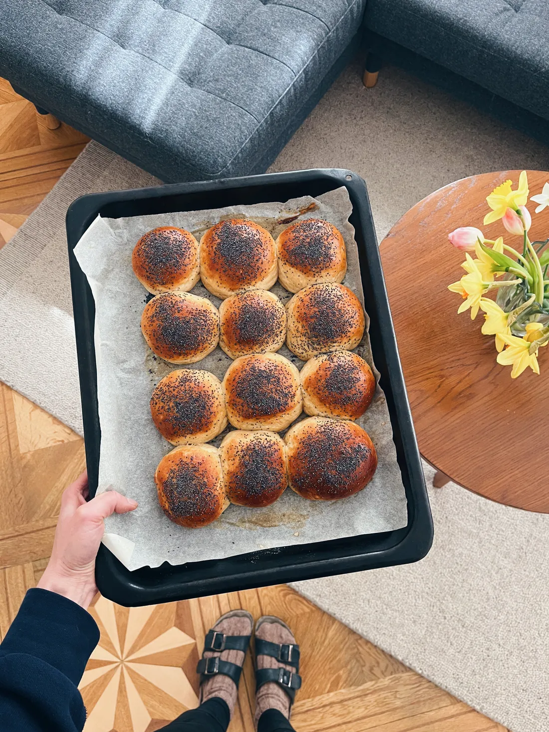 Sice mi při pečení popraskaly (byly nedokynuté a myslela jsem si to, ale věřila jsem receptu - příště je nechám kynout dýl a budu věřit svému instinktu). Každopádně si je příští týden upeču znova, protože byly neskutečně dobré.