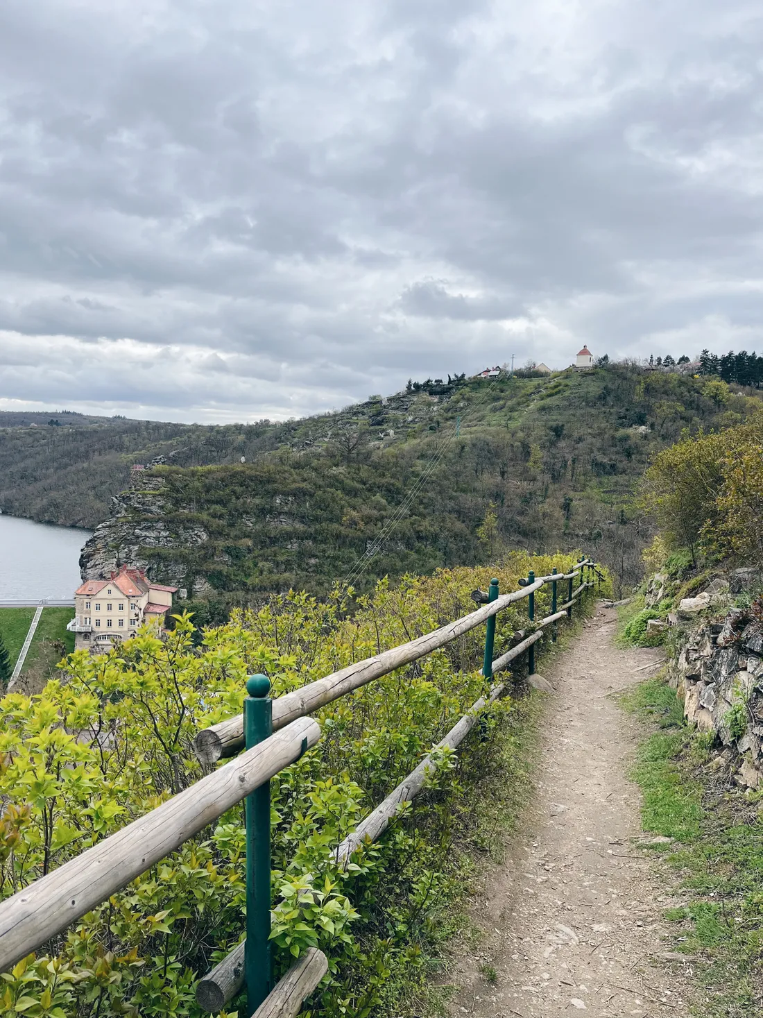 Úterní odpoledne jsme s Čotym šli na pořádnou procházku. Nejdřív jsme vyšli z Gránic. Na fotce je znojemská přehrada a Krammerova vila postavená na skále. A na kopci Eliášova kaplička s vyhlídkou.