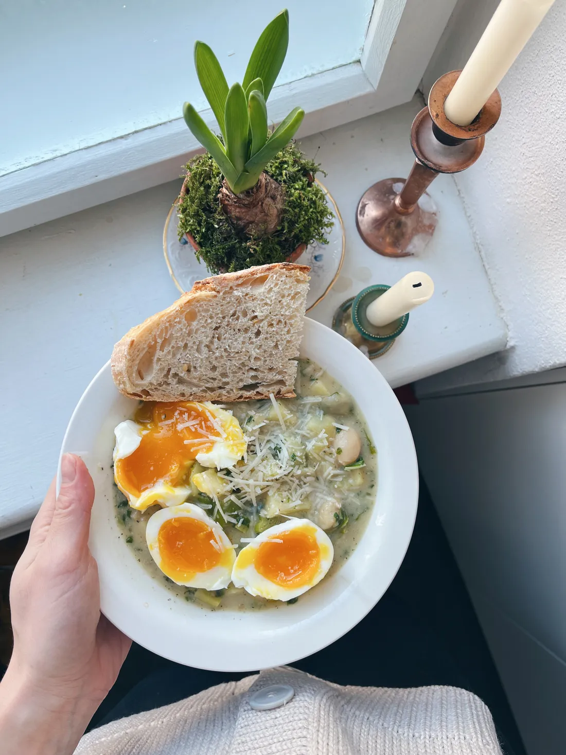 Oběd, který nevypadá kdovíjak, ale byl moc dobrý. Hustá polévka z pórku, brambor, bílých fazolí a se špenátem. Na talíři jsem přisypala trochu pecorina a vajíčka jsem uvařila doměkka, aby žloutek zůstal napůl tekutý.