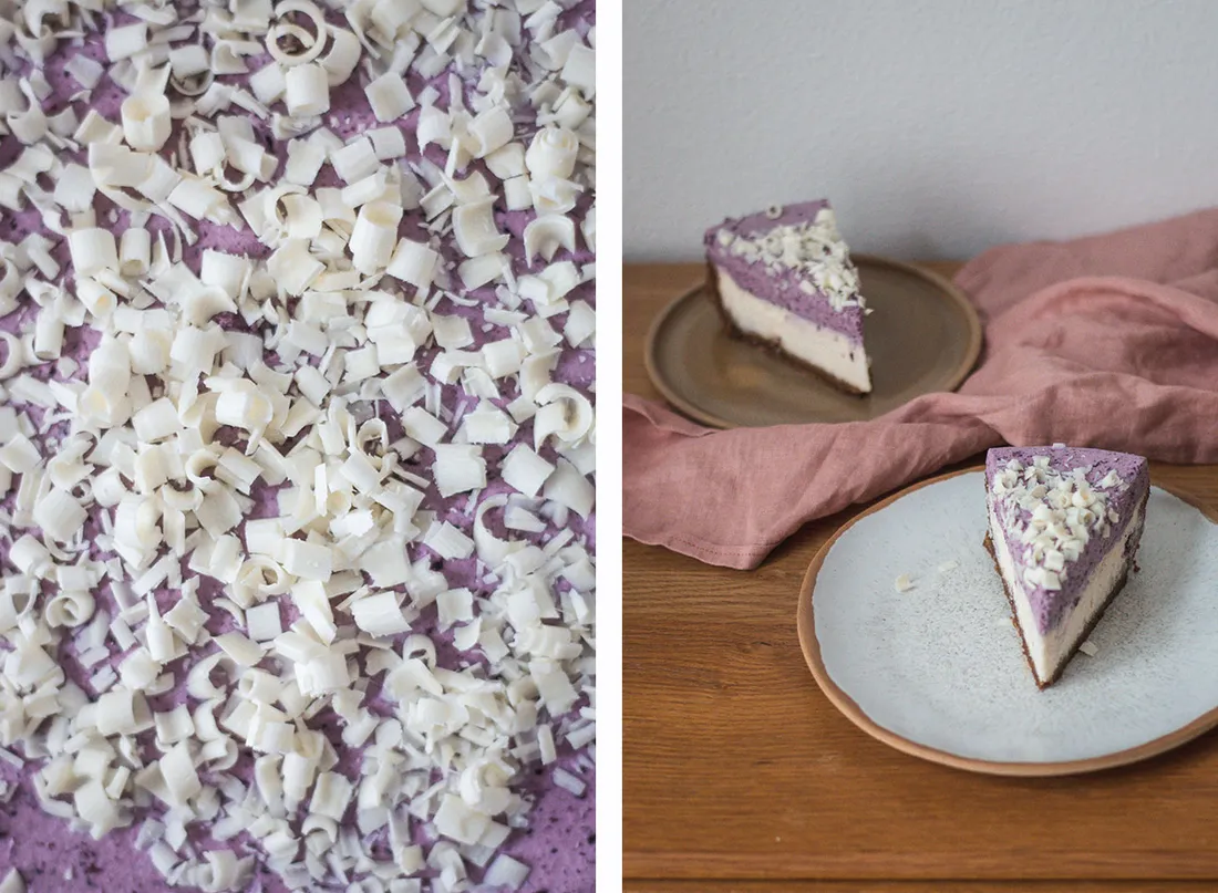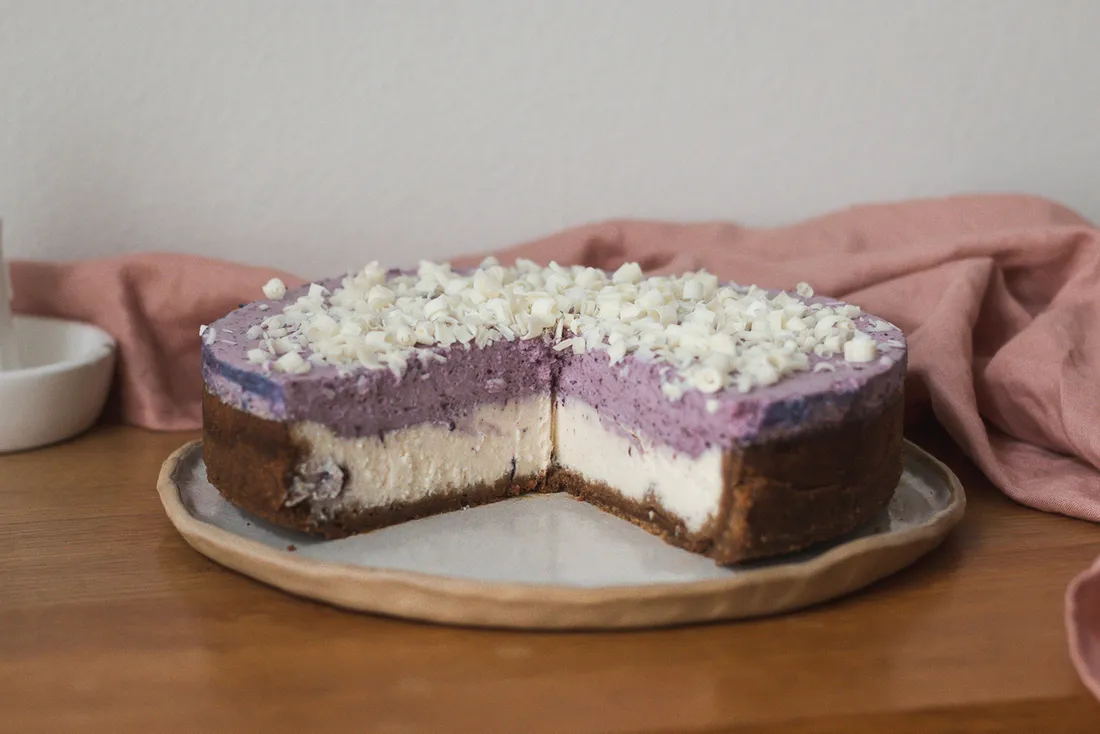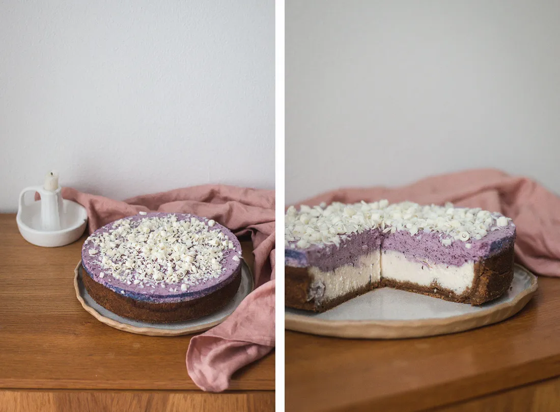 Krémový vanilkový cheesecake s korpusem, který chutná jako slaný karamel, lehounkou pěnou z borůvek a hoblinkami bílé čokolády. Můj dnešní recept je velká dobrota!