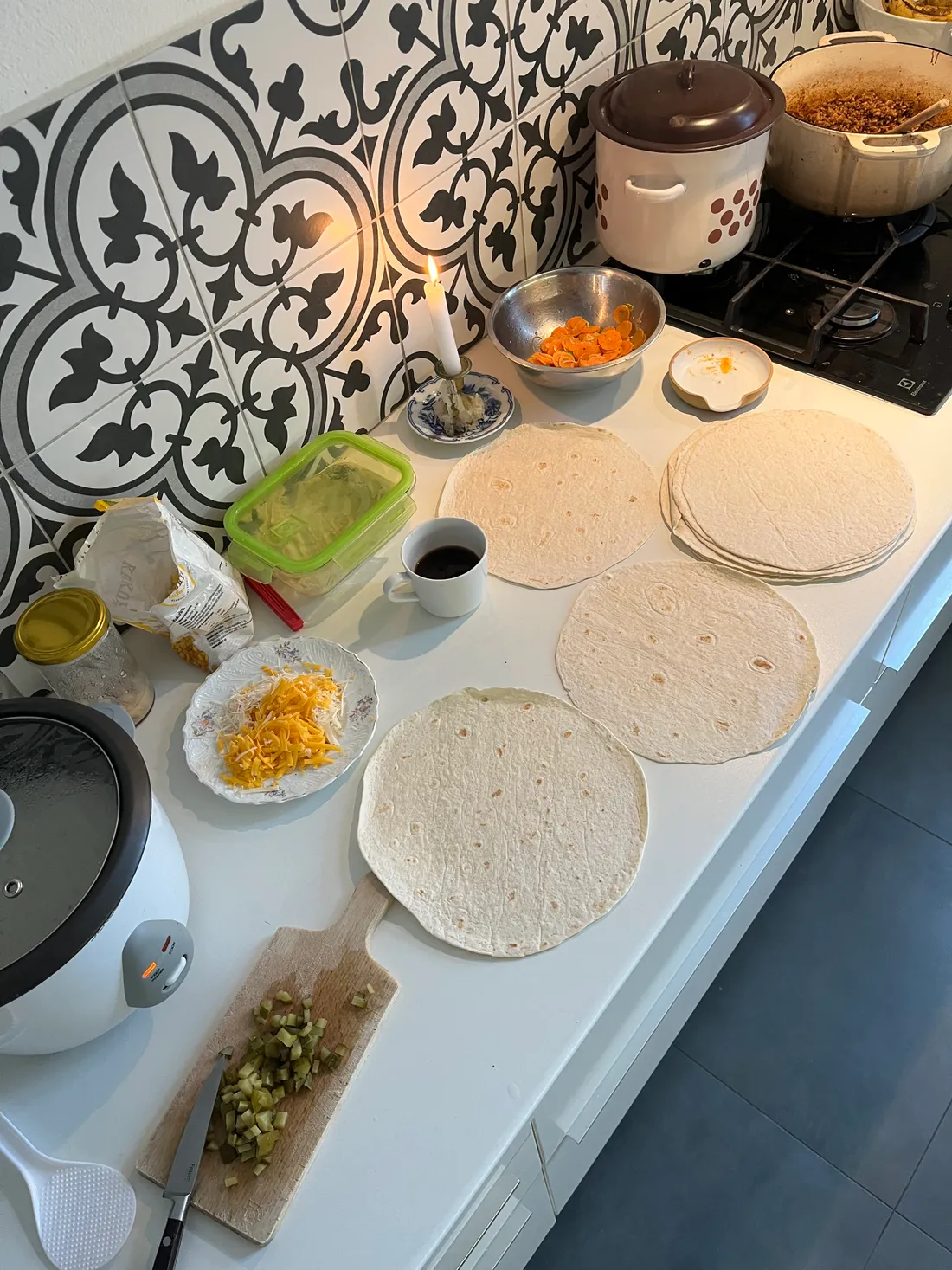 Manžel vzal děti ven a já jsem na přání dcerky vařila burrito. Do tortilly jsem zamotala rýži, osmažené mleté maso, čedar, kukuřici, kyselé okurky, hummus a celé jsem to zapekla na kontaktním grilu.