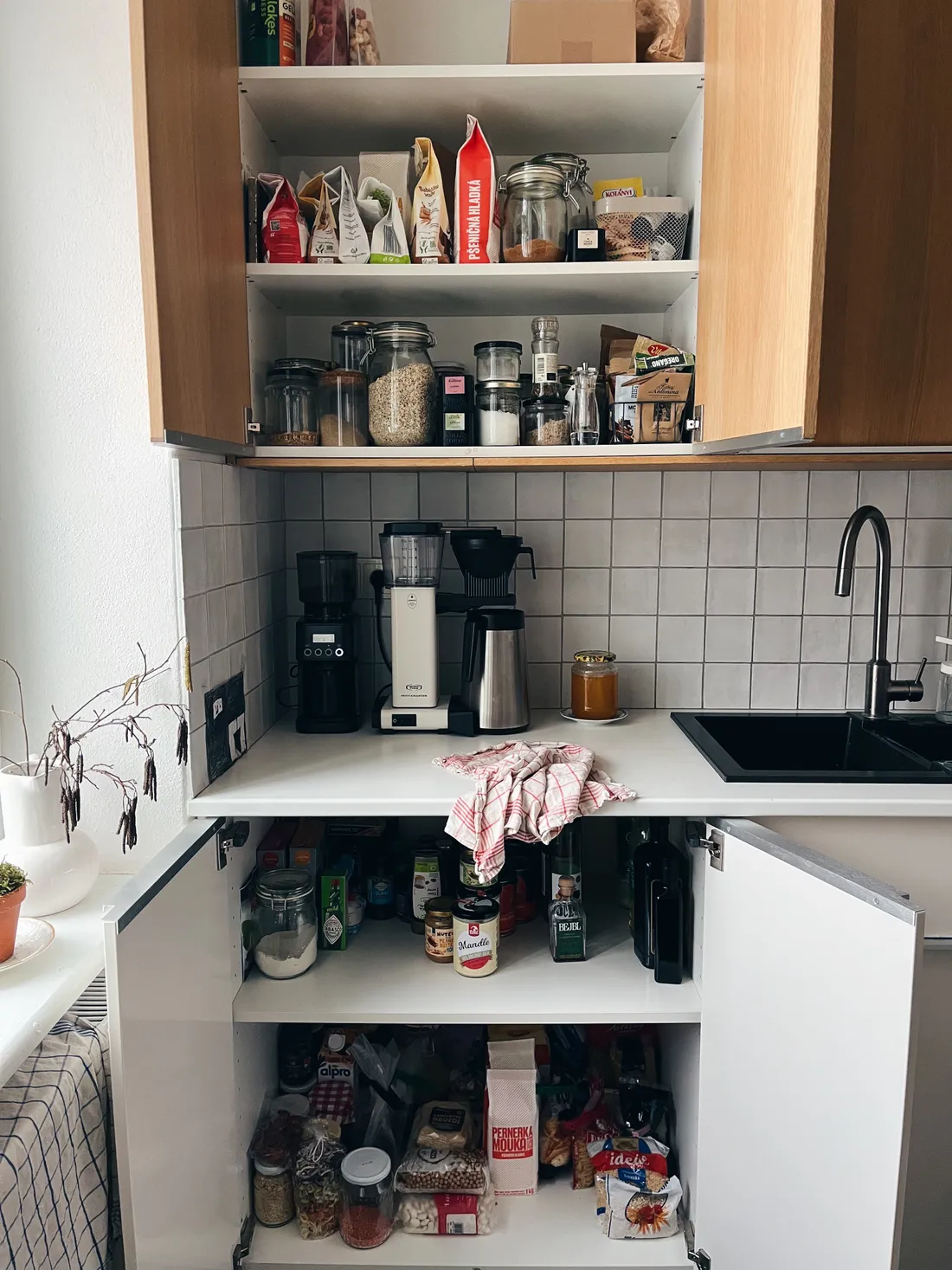 Nahoře mám koření, semínka, vločky, oříšky a poličku se surovinami na pečení. Police pod linkou je taková spíž, skladuju v ní plechovky, další mouky, těstoviny, rýži, octy a oleje a podobně.