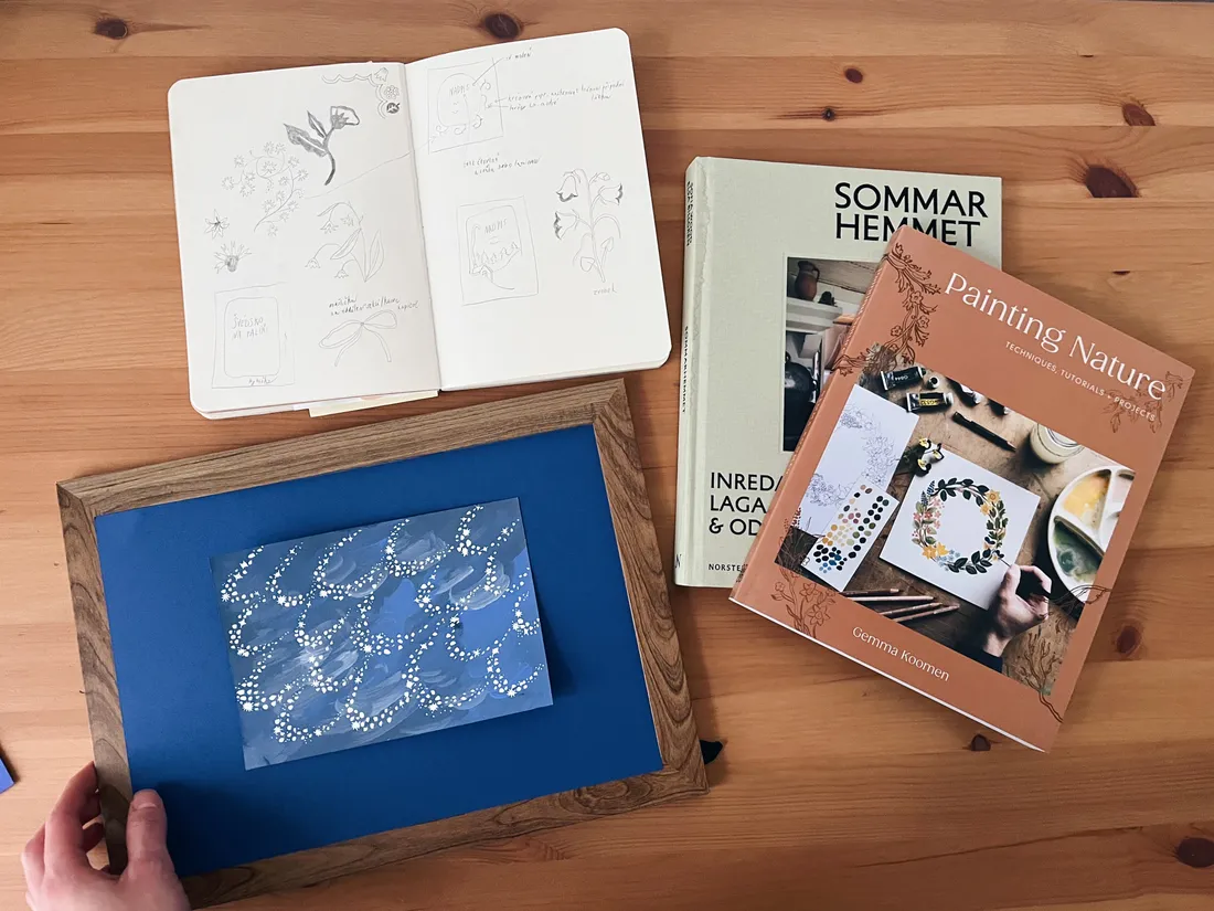 Poslední volnou páteční chvíli jsem věnovala vybírání správné barvy modrého papíru jako podklad ke své ilustraci a návrhu obálky pro novou kuchařku.