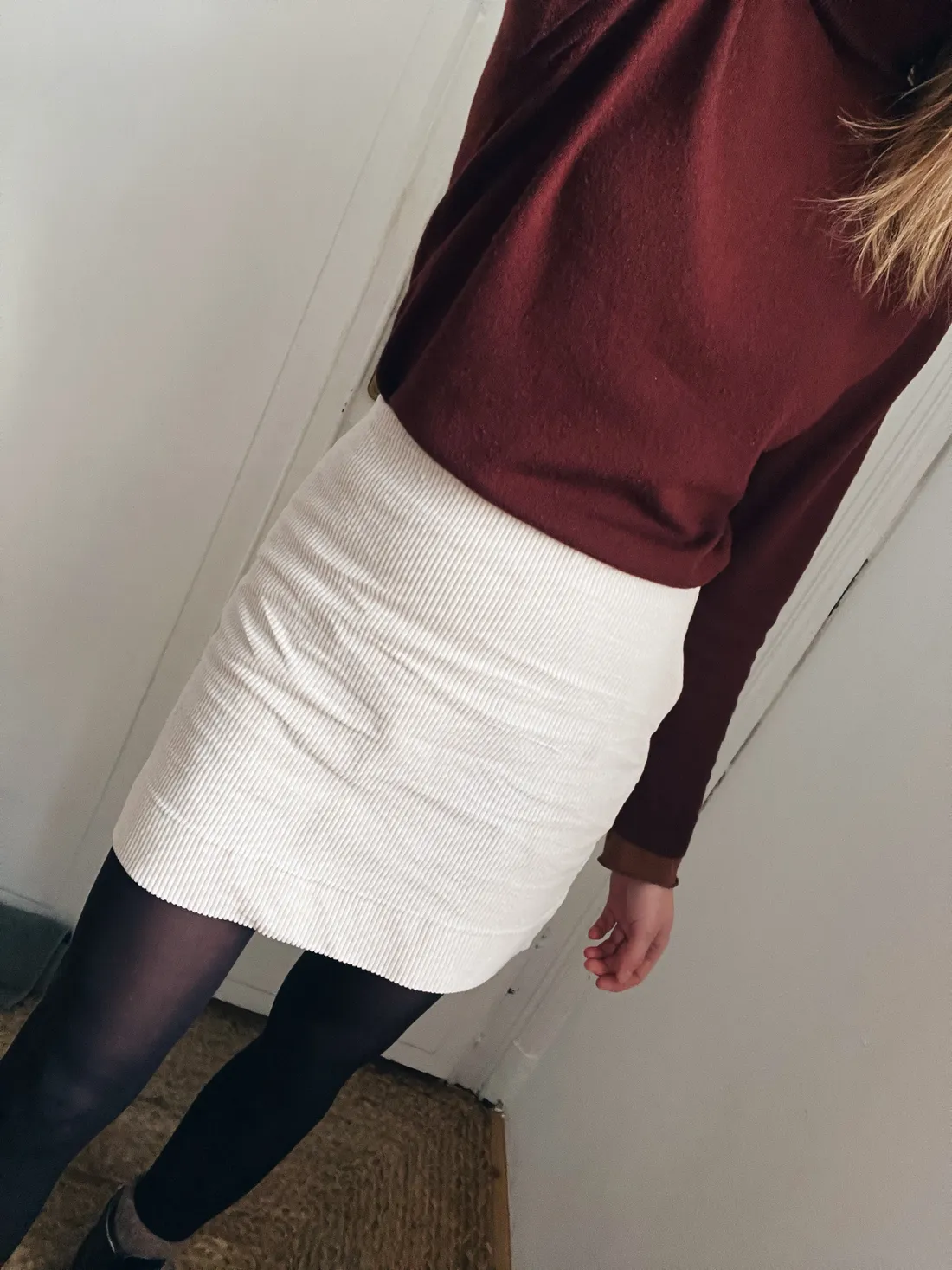 V pondělí jsem po dlouhé době vytáhla ze skříně něco jiného než legíny a mikinu, protože jsem dopoledne potřebovala něco zařídit a projednou jsem neseděla jen doma u počítače. Volba padla na merino rolák a krémovou manšestrovou minisukni (obojí z Lindexu, rolák mám nový, sukni jsem ulovila na vinted - tady je ta stejná v černé barvě).