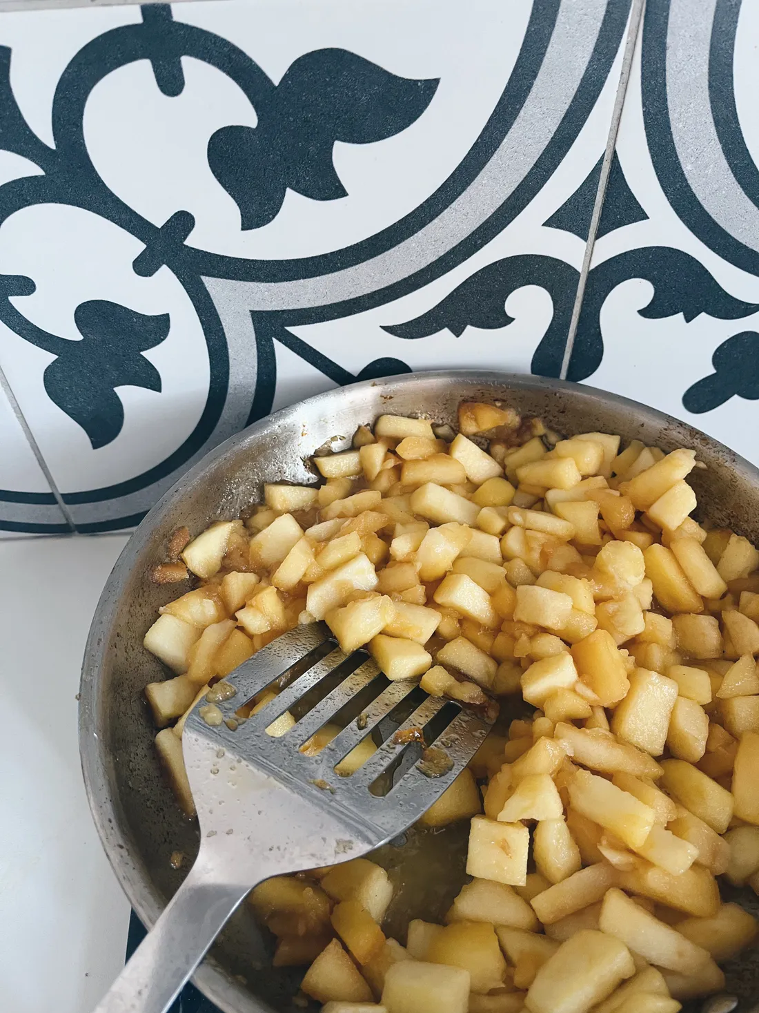 Na pánvi jsem rozpustila trochu cukru (nerezová je na to ideální) a do zlatého karamelu jsem vmíchala jablka na kostičky, aby se v něm uvařila a získala slaďoučkou chuť.