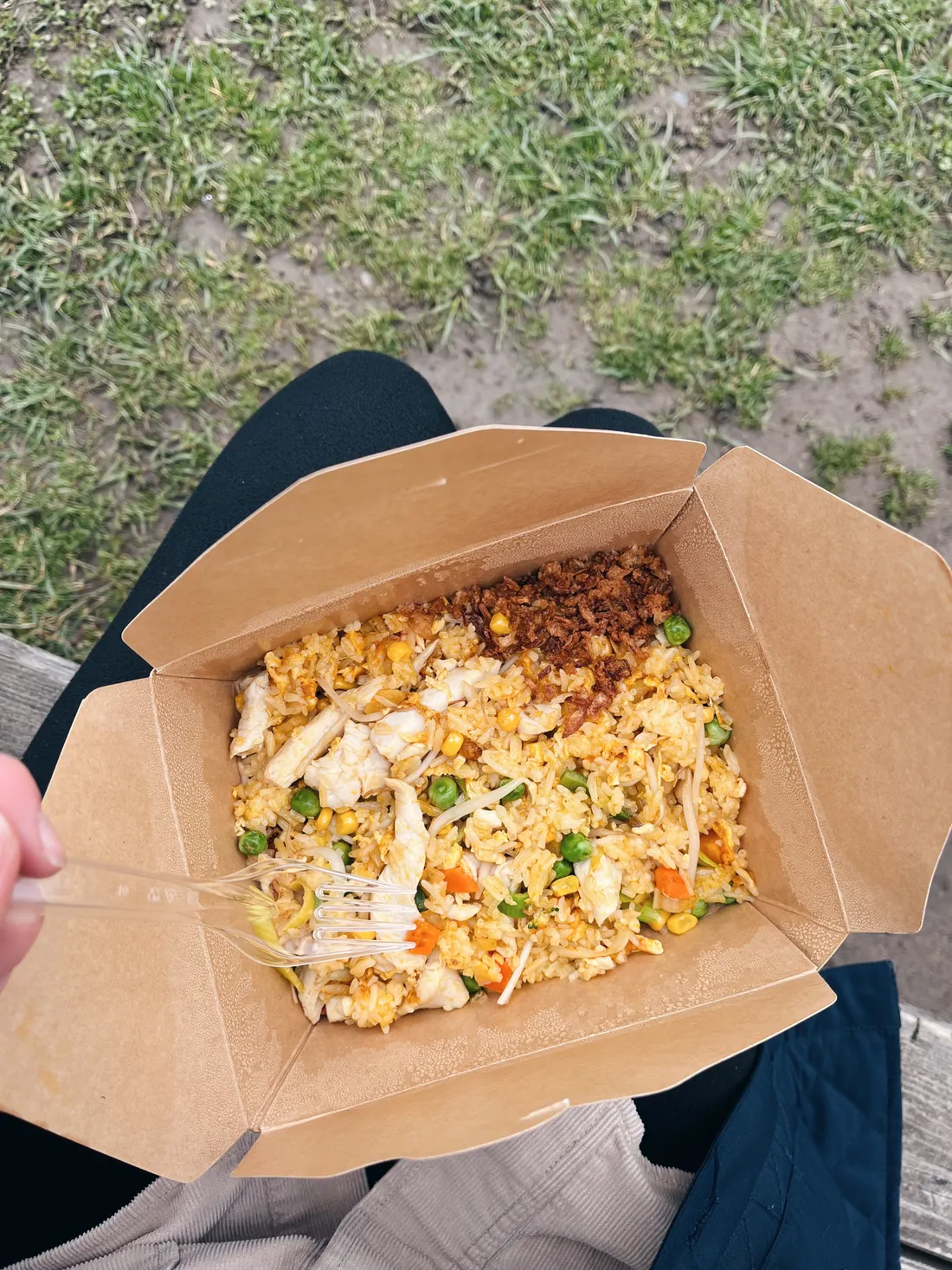 Po cestě zpátky za mužem jsem nám k obědu koupila smaženou rýži a smažené asijské nudle v místní restauraci Sakura.