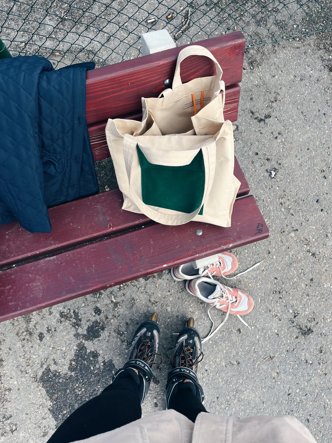 Po obědě jsme se rozdělili - manžel šel ven s dcerkou a já jsem šla na zmrzlinu se synem. Na sebe jsem vybrala tričko s dlouhým, široké kalhoty, vintage kabelku a semišové balerínky.