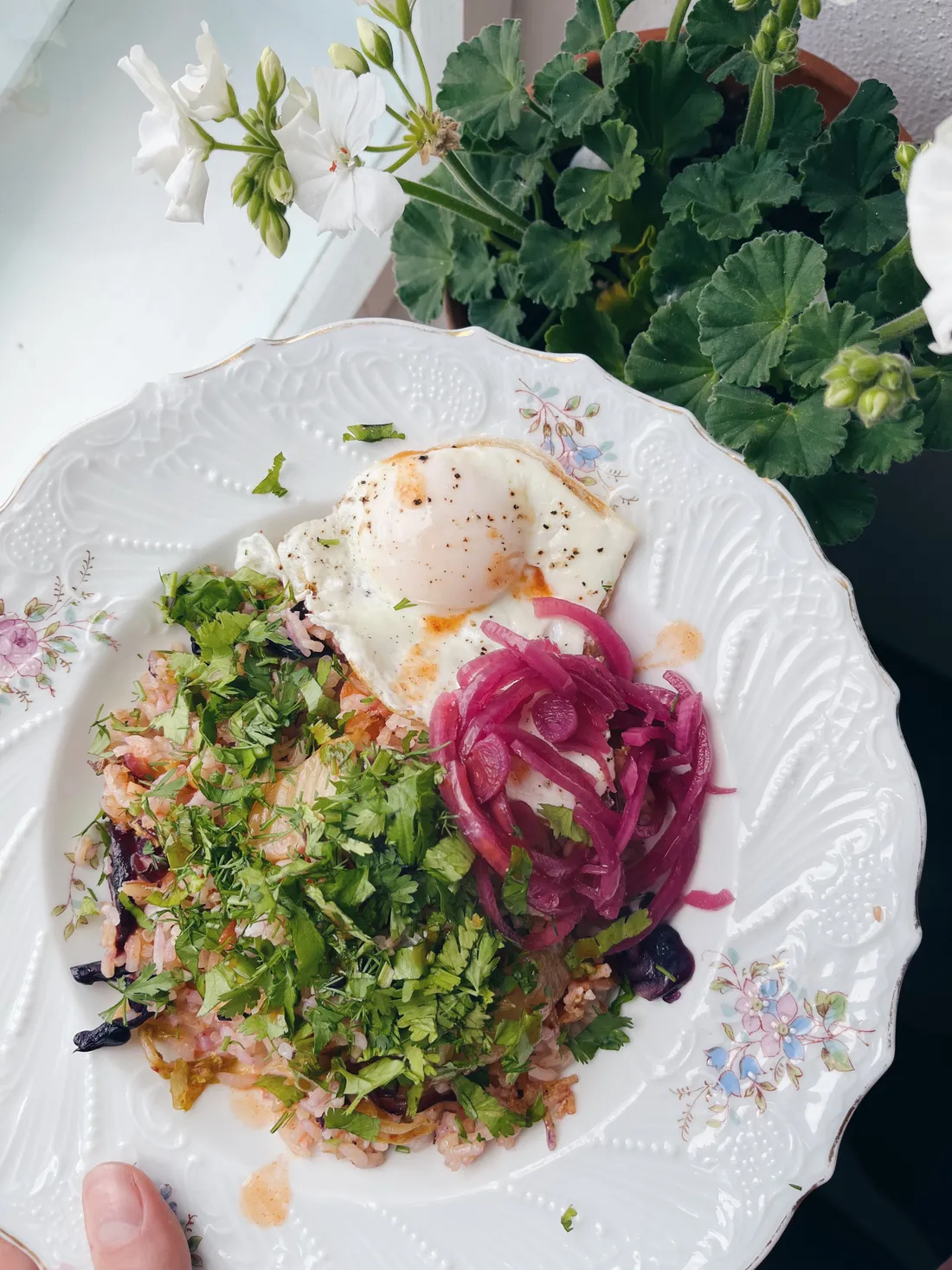 K obědu jsem zužitkovala zbytky, byla smažená rýže se zeleninou, kimchi, vejcem, naloženou červenou cibulkou a koriandrem.