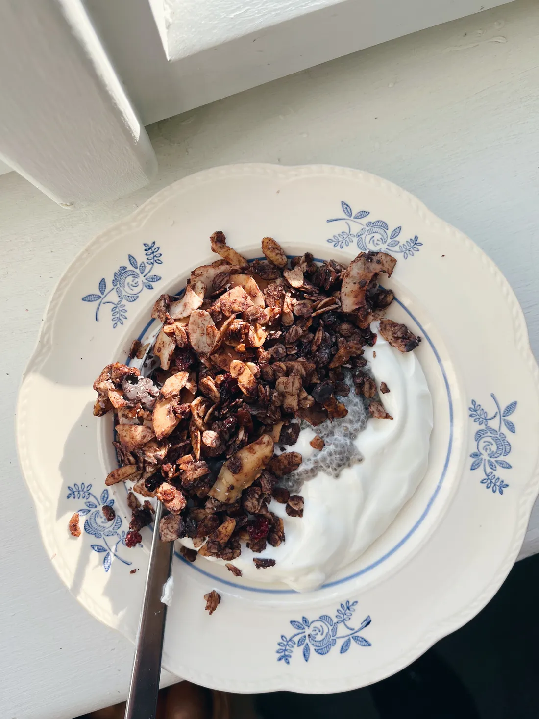 V pátek ráno jsem snídala kakaovou granolu podle tohoto receptu, jen jsem do ní vmíchala 2 lžíce kakaa.