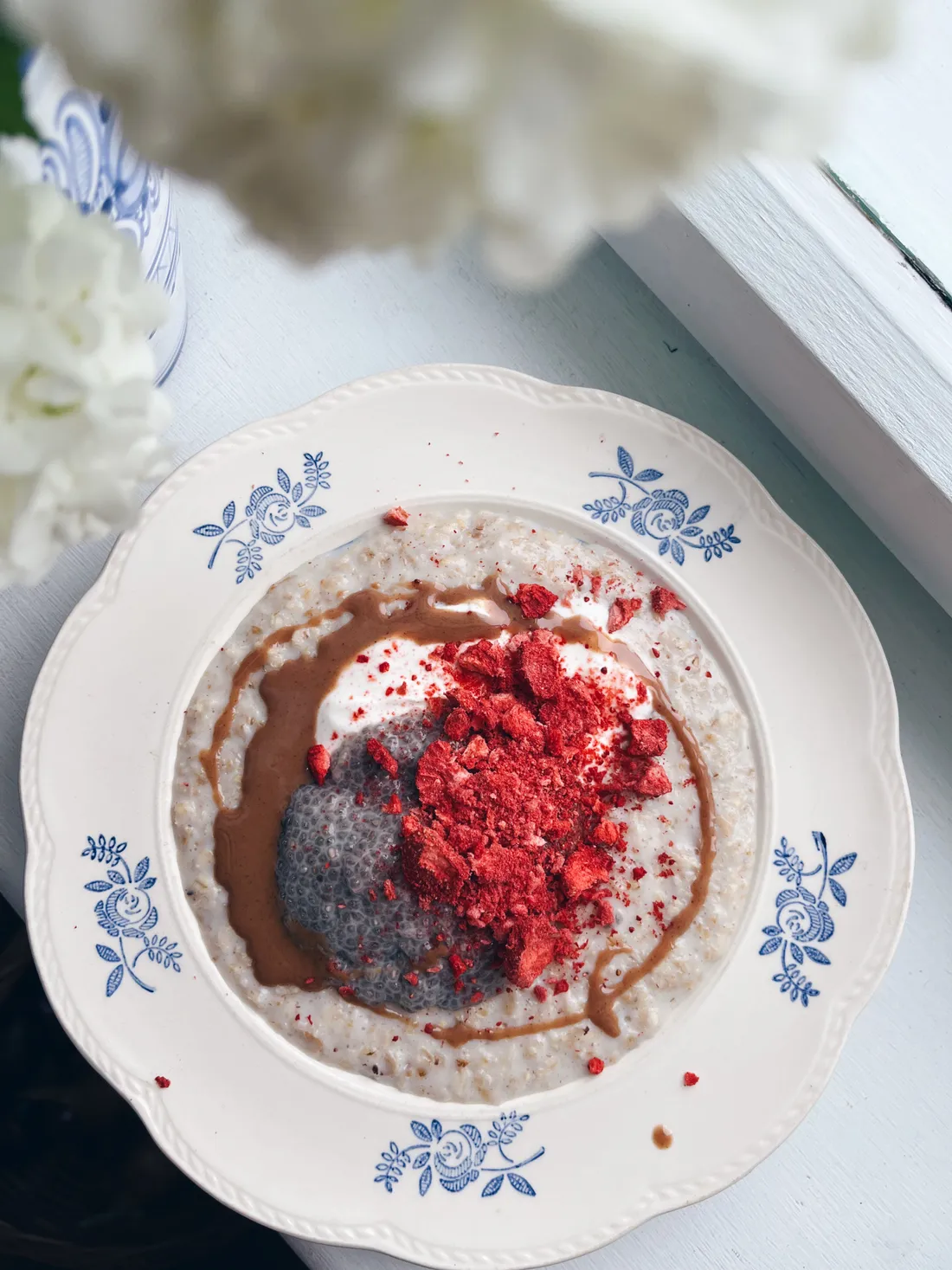 Ke snídani byla ovesná kaše s chia pudinkem, návykovým lískooříškovým máslem a mrazem sušenými jahodami.