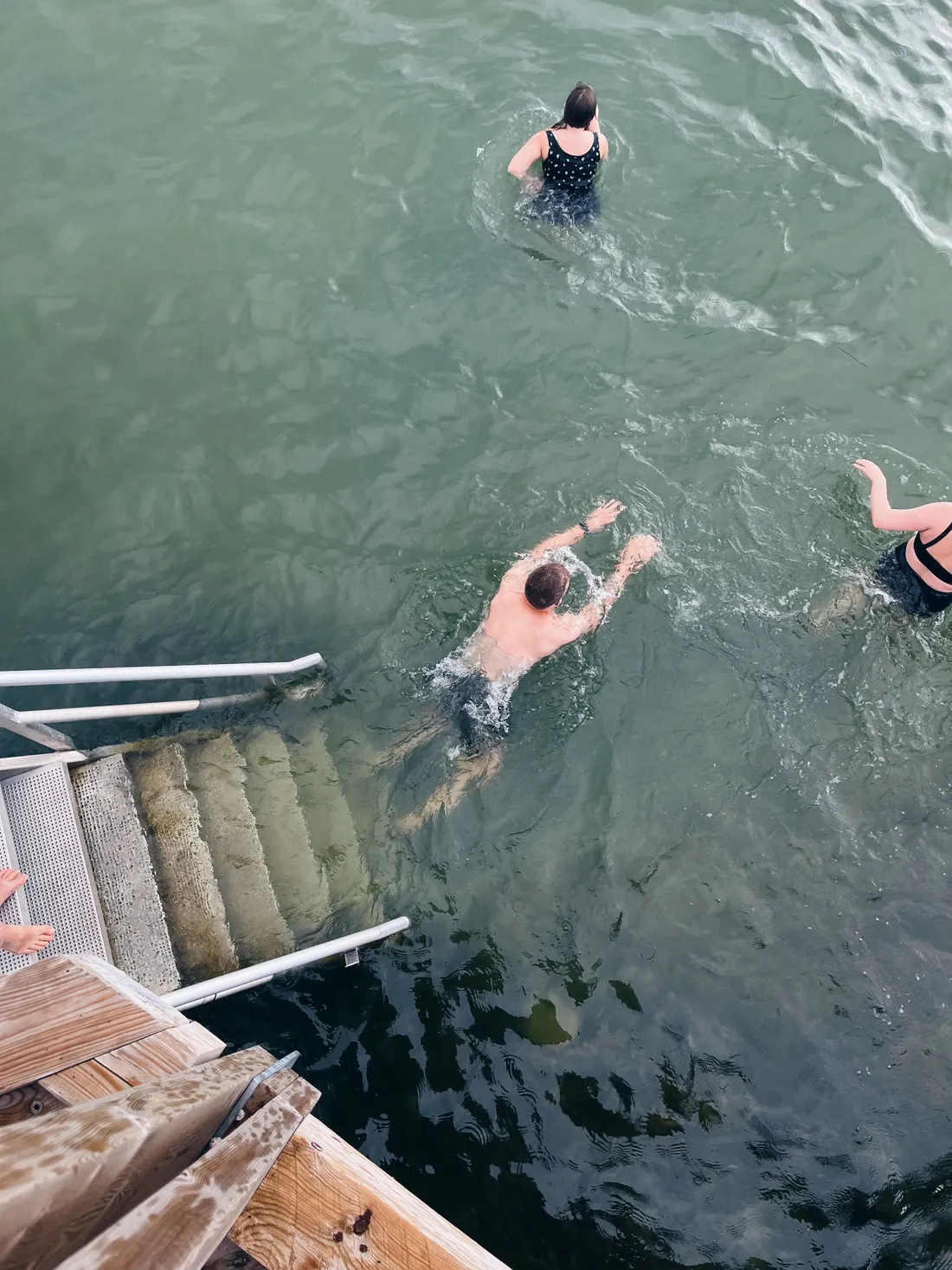 ...koupání! Mně se nechtělo, ale když jsem viděla, že můj muž jde, šla jsem i já. Voda byla nakonec překvapivě teplá (respektive teplejší než vzduch, takže třeba 19 °C?).